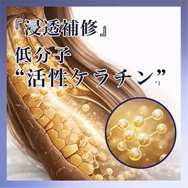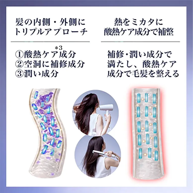 ダメージ毛に特有の乾いた手触りにも配慮し、3種の『形状補整』*6成分を重ねることで、きしみの少ない、硬く固めず、やわらかな仕上がりを追求しました。
