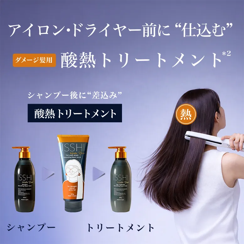 イッシ独自の酸熱メソットで、ダメージによる髪の歪みを補正し、ハリコシのあるまっすぐ髪へ*1 カラー・ブリーチ毛で起こりやすいパサつきや広がりに着目し、扱いやすさを高める設計として、レブリン酸*7 を軸にトステア®*8 、グリオキシル酸*9を採用。